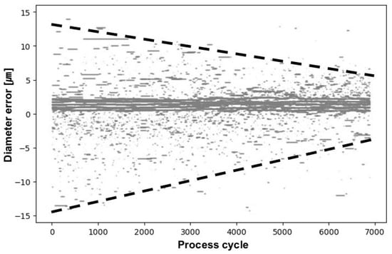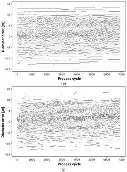 Figure 3 shows the dimensional distribution of outer ring raceway diameter errors in the slots over time from some of the data obtained from the assembly facility to illustrate how the distribution changes as the assembly process proceeds. Over time, the diameter errors gradually converge to similar values. As this dimensional concentration phenomenon intensifies, the diversity of the outer rings decreases, thus reducing the probability that the combinations satisfy the assembly tolerance. This phenomenon occurs because the dimensional distribution of the outer and inner ring raceway diameter errors becomes unbalanced as the machine tools undergo constant wear and adjustment. However, changes in this distribution are difficult to control precisely in the machine tools. Therefore, a selection strategy should be developed to balance the supply and assembly frequencies throughout the range of the outer ring raceway diameter.