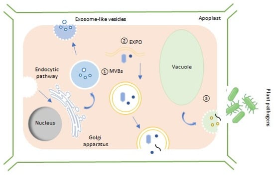 EXPO are double-membrane structures, similar to autophagosomes, that fuse with the plasma membrane and release vesicles into the apoplast. EXPO-derived vesicles have a size range of 200–500 nm and are characterized by the presence of the exocytosis complex EXO70E2 [].