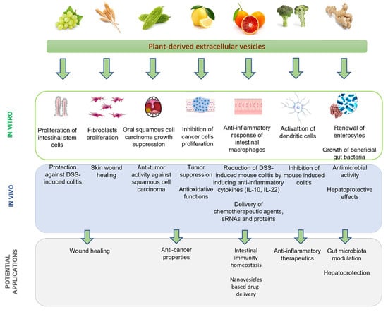 A summary of the anticancer, anti-inflammatory and regenerative properties of plant-derived vesicles evaluated through in vitro and in vivo experiments is shown in Figure 2 and Table 4.