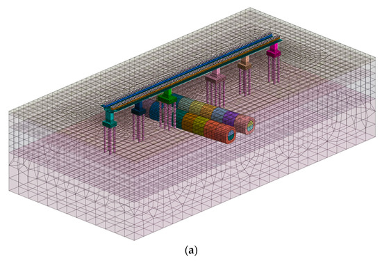 Solid element simulation is used for soil and bridges to avoid stress concentration [31]. The initial support of the new tunnel is simulated by the shell element, the pile foundation is simulated by the beam element, the F rail and rail sleeper in the Maglev track are simulated by the beam element, and the connection is elastic. Grouting reinforcement is simulated by the solid element, and grouting reinforcement construction is simulated by endowing the model grouting reinforcement area with the original soil layer grouting properties. The ground surface (the upper surface of the model) is taken as the free boundary, and normal constraints are taken around and at the bottom of the model. The calculation model is shown in Figure 8 and the calculation parameters are shown in Table 3.
