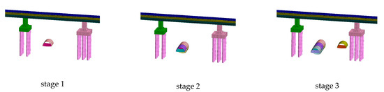- The maximum deformation value of the pier adjacent to the tunnel crossing position is −1.73 mm and the maximum vertical deformation value of the magnetic levitation rail is −1.56 mm. It can be seen that the settlement deformation of the pier will be attenuated after passing through the pier, bearing, bridge, and track beam to the rail. Because the bridge is a continuous beam, the deformation curve of the rail is relatively flat, and there is no obvious differential settlement between the rails.