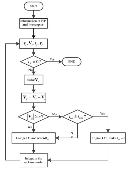 , the required velocity and engine thrust direction could be solved. By determining the interceptor’s engine switch logic in the midcourse guidance stage, the interceptor engine can be timely switched on for online correction. An online correction algorithm for the interceptor in the midcourse guidance is designed as shown in