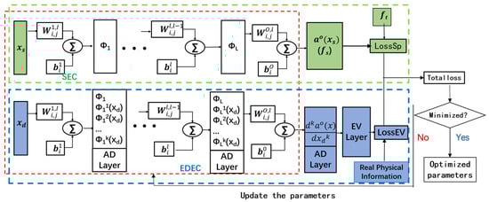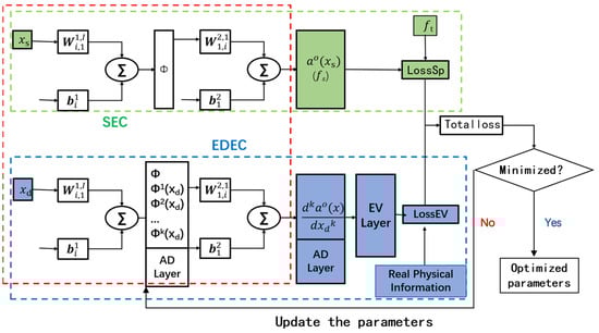 The extreme-points-distribution-based neural network (EDNN) is composed of an input layer, hidden layers, an output layer, an automatic differentiation layer, an extreme points distribution feature layer and a loss function containing extreme points distribution errors. As shown in Figure 2, the EDNN contains a sample error calculator (SEC) and an extreme points distribution error calculator (EDEC). The total loss function of the EDNN is composed of the sample error loss function LossSp and the extreme points distribution error loss function LossEV.