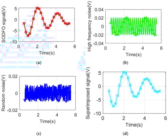 The simulation model of SODFO signal is shown in expression (35). Additionally, the simulated signal is a cosine-shape curve with decreasing amplitude (shown in Figure 4a). The simulation model of the high-frequency noise is shown in expression (36). Moreover, the simulated high-frequency noise is a cosine signal with a frequency 10 times the frequency of the SODFO signal (shown in Figure 4b). The simulation model of the random noise is shown in expression (37). Further, random noise is a uniformly distributed noise on [−0.01, 0.01] (shown in Figure 4c). The superposition of the higher-order noise and random noise on the SODFO signal does not change the amplitude, apparently (shown in Figure 4d).