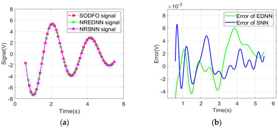 SODFO signal, NRSNN signal, NREDNN signal and the errors. (a) SODFO signal, NRSNN signal, NREDNN signal; (b) errors between the NRSNN signal, NREDNN signal and SODFO signal.