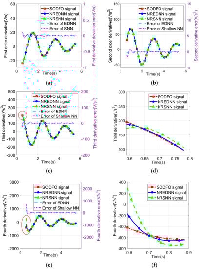 Figure 6e is the fourth-order derivatives and the errors. The fourth-order derivatives of the NRSNN signal and the NREDNN signal coincide with the fourth-order derivative of the SODFO signal. The maximum error of the fourth-order derivative of the NREDNN signal is 39.92 percent of the maximum amplitude of the fourth-order derivative of the SODFO signal. The maximum error of the fourth-order derivative of the NRSNN signal is 114.24 percent of the maximum amplitude of the fourth-order derivative of the SODFO signal. The error of NREDNN signal is less than that of the NRSNN signal (Figure 6f).
