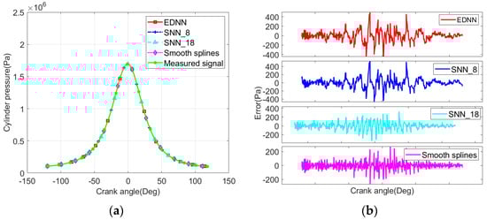 It can be seen in Figure 8b that the second-order derivative of the noise-reduced signal from the EDNN and the SNN_18 neural network is consistent with real trend and there is no fluctuations deviating from the physical trend. The second-order derivatives of the noise-reduced signal from the SNN_8 neural network and the smoothing splines showed small fluctuations. Further, the second-order derivative of the measured signal shows frequent fluctuations deviating from the physical trend in the whole crank angle range.