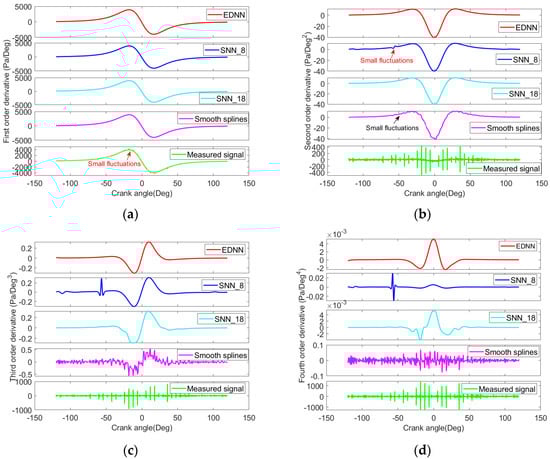 In summary, the noise reduction performance of the EDNN is better than that of the SNN_8 neural network, the SNN_18 neural network and the smoothing splines. Further, there is no trend discrepancy in the first- through fourth-order derivatives of the noise-reduced cylinder pressure signal from the EDNN.