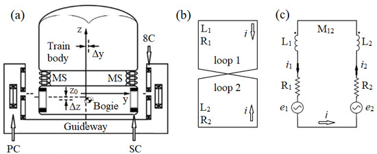 (a) Diagram of the main components of the JR–Maglev, Yamanashi test track. PC: propulsion coil. MS: mechanical suspension. SC: superconducting coil. 8C: figure-eight-shaped coil. (b) Sketch of the null-flux coils. (c) Equivalent electrical circuit. The numbers 1 and 2 refer to the upper and lower loops of the coil, respectively [41].