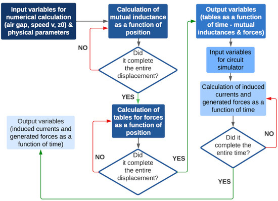 The input for this algorithm encompasses the physical parameters of the coils, specifically those outlined in Table 1, along with variables such as train speed, lateral air gap, and the train’s relative “height” concerning the guideway coils. Only the self and mutual inductances of the loops of the same null-flux coil and its resistance were calculated, utilizing Newmann’s formula and Ohm’s second law, respectively [41].