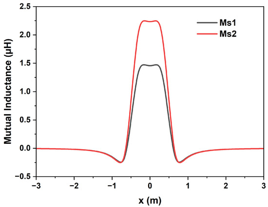The simulations focused on a type of EDS system without cross-connections, using one 8-shaped coil and one SC coil. Wolfram’s Mathematica software, version 12.1, performed the numerical calculations. The magnetic flux was calculated for a total distance of 32 m traveled by train, with 1-centimeter steps, totaling 3201 points, in the x-direction, from position to m. In the y-direction, the distance between the SC and 8-shaped coil centers was meters, corresponding to the air gap shown on the Yamanashi test line. In the z-axis, the center of the SC coil was offset by meters below the center of the 8-shaped coil. This offset was the position. The mutual inductance as a function of position was then calculated using Equation (3) [44]: