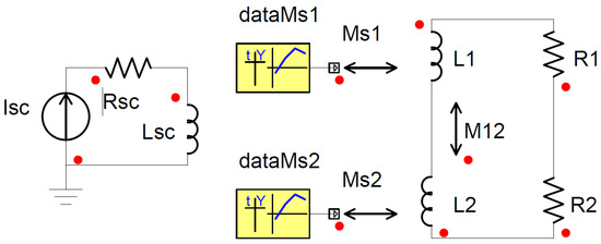 Circuit implemented in Ansys Twin Builder software. The indices 1, 2, and sc refer to the upper and lower loops of the 8-shaped and the SC coil, respectively. Data: data tables with mutual inductances and .