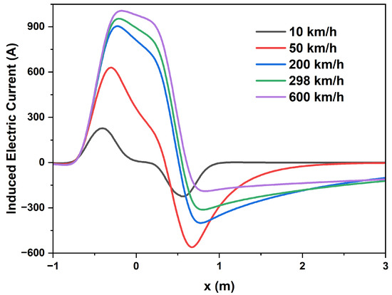 The value of magnetic coupling between the onboard and off-board coils, expressed by the mutual inductance, is low due to various factors, such as the distance between the coils and the fact that air served as the core of both coils, among other reasons. Precisely for this reason, the magnetic field powering the circuit must be intense, thus requiring the use of the SC coil. Another observation was that the magnetic coupling between the lower loop of the 8-shaped coil and the SC coil was greater than the coupling between the upper loop and the SC coil because the vertical deviation between the coils results in more magnetic flux in the lower loop than in the upper loop of the ground coil. Figure 7 presents the induced currents obtained at the five operational speeds, which agreed with the findings in the literature that the induced currents become positive with increasing speed [21,36,45].