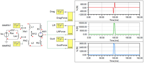 The electrical equivalent circuit of an 8-shaped coil powered by three SC coils, forming a null-flux EDS system at a cruising speed of v = 600 km/h, was implemented in the Ansys Twin Builder software, which also displays the respective force curves generated as a function of time. The red, green, and blue lines represent drag, lift, and guidance forces, respectively.