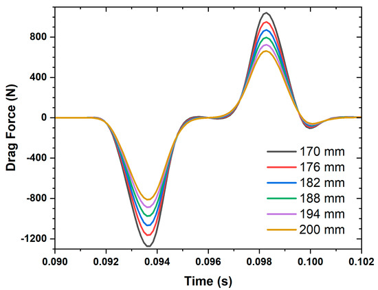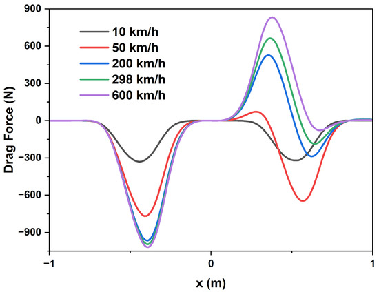 The change in the behavior of the induced electric current was due to the longitudinal force component , which consists of a conservative part and a dissipative part [13]. The dissipative term, which represents the magnetic drag of the system over a period, can be observed in Figure 9. It always decelerates the train, directly proportional to the electric currents in both coils, and inversely proportional to the train’s speed. As a characteristic of EDS systems, the drag force reaches its maximum value at low speeds and tends to have a constant value at high speeds [32,46].