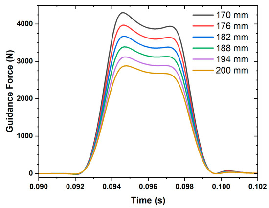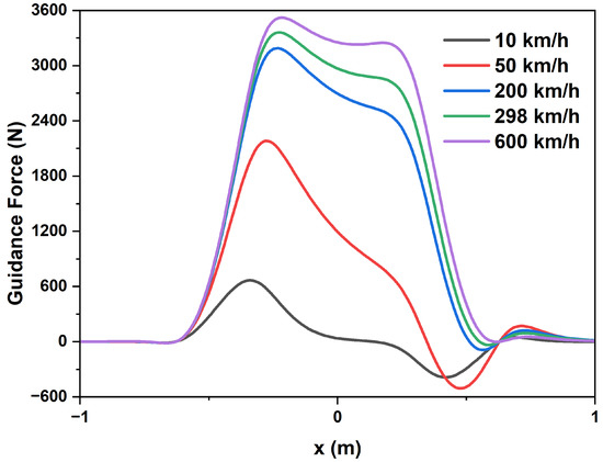 Figure 17 portrays the relationship between the guidance force and speed. As speed increased, the guidance force gradually rose. However, after reaching a speed of 200 km/h, the guidance force increased at a slower rate. This behavior mirrored the relationship observed in the levitation force–speed characteristics. At higher speeds, the induced current remained relatively stable due to the skin effect, leading to a tendency for the guidance force to approach saturation.