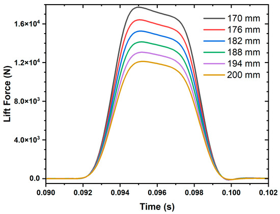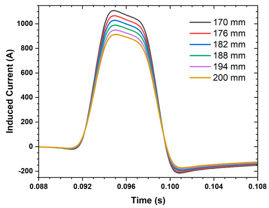 Figure 7 demonstrates that the induced currents became positive with increasing speed. As the leading edge of the SC coil approached the 8-shaped coil, the induced current increased. Conversely, it decayed and turned negative as the trailing edge of the SC coil moved away from the 8-shaped coil. This alternation of the current signal induced by the same SC coil implied that it received a repulsive impulse when approaching and an attractive impulse when moving away. Consequently, the lift force oscillated between positive and negative values at one period. As the speed increased, the effect of the oscillating lift force ceased, as seen in Figure 11. The current induced in the 8-shaped coil no longer changed sign, and the lift force remained consistently positive.