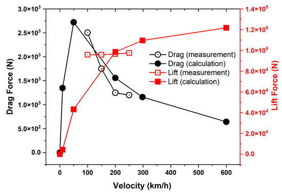 Levitation and drag forces as a function of displacement speed. A comparison between the model utilizing the circuit simulator and experimental measurements conducted on the Yamanashi test line. The configuration consists of four SC coils onboard and twenty 8-shaped coils on the guideway.