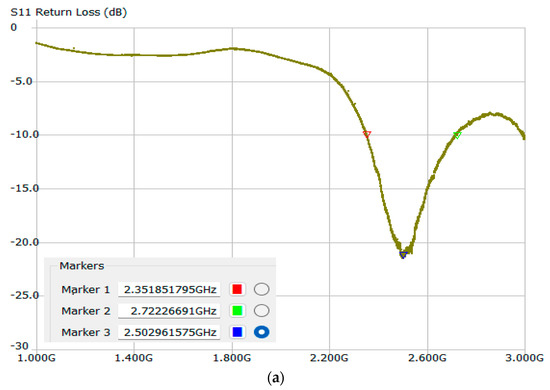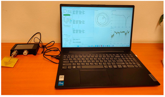 After the construction of the structure on the FR4 epoxy substrate, the S parameters were measured with the help of the nanoVNA SAA-2N, and the experimental stand is presented in Figure 3. The parameters can be obtained on the display of the VNA and also using the dedicated software NanoVNA Saver v0.5.3.