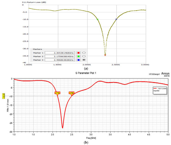 S11 values obtained for the optimized structure: (a) measured; (b) obtained through numerical analysis.