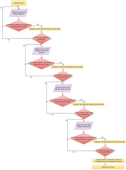 Beginning from this point, the antenna must be improved from the gain and bandwidth point of view; thus, a number of variations were considered. For a better understanding of this process, a diagram is presented in Figure 6.