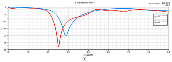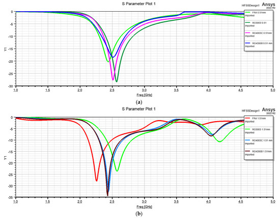 S11 values obtained for the structure with different dielectrics with thicknesses: (a) 0.51 mm; (b) 1.51 mm.