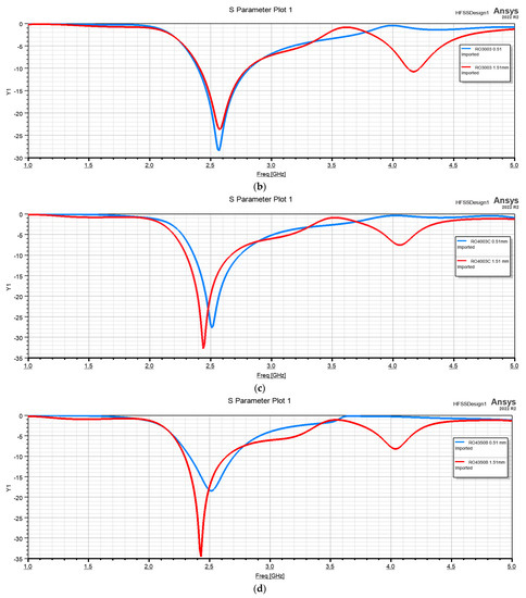S11 values obtained for the structure with different dielectric thicknesses for: (a) FR4; (b) RO3003; (c) RO4003C; (b) RO4350B.