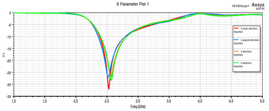 For this study, four different cases were considered: namely, structures with 5 directors, 4 directors, 3 close directors and 3 spaced directors (Figure 9). This study was made in order to determine if the dimensions of the antenna could be reduced. Analyzing the S parameters (Figure 10), it can be concluded that the number of directors does not significantly influence the bandwidth of the antenna.