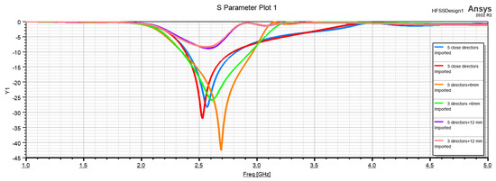 The study was continued with the increase in the director’s dimensions, in which we increased the director’s length by 4 mm, 6 mm, 8 mm and 12 mm. It can be observed that if the antenna’s director length is increased by more than 12 mm, the antenna does not function in the considered frequency range.