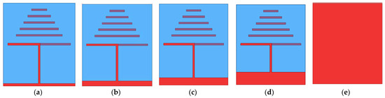 Structures with different grounding dimensions: (a) 2 mm; (b) 4 mm; (c) 6 mm; (d) 10 mm; (e) total grounding.