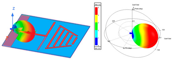 In Figure 5, the gain of the antenna is presented, and the maximum value obtained from the numerical modeling of this structure is 3.6917. The antenna is linearly polarized.