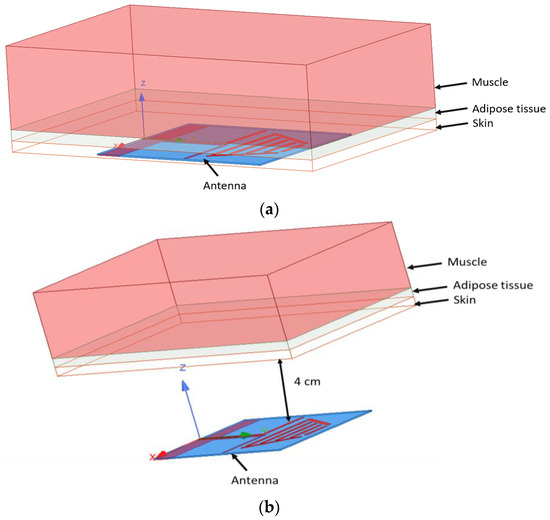 Antenna with the 3 different tissues: (a) antenna placed on the skin; (b) antenna at a distance of 4 cm from the tissues.