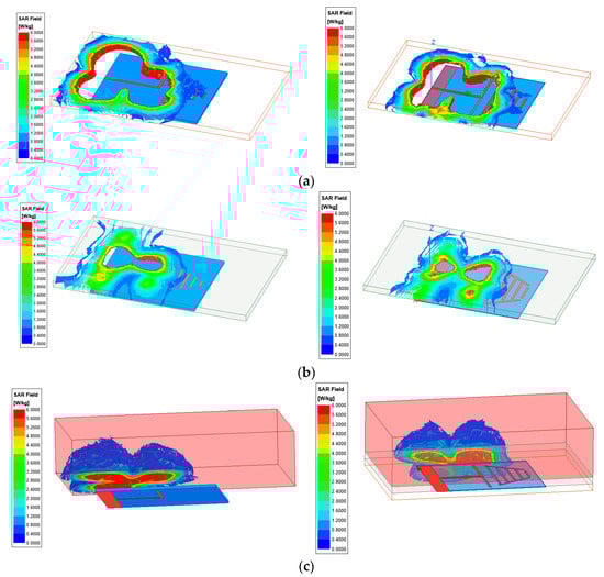 SAR distribution in the tissue layers for the initial and optimized antenna: (a) skin; (b) adipose tissue; (c) muscle.
