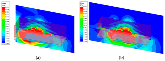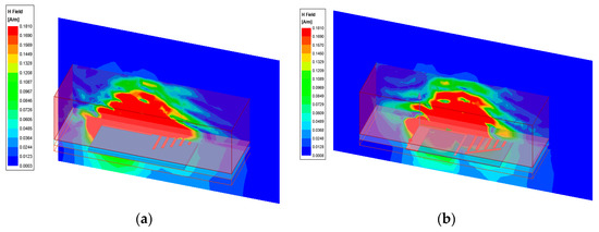 When the tissues are placed at a distance of 4 cm from the antennas (Figure 23 and Figure 24), the values of the electric and magnetic field are exceeding the standard limits for a wider area around the antenna than in the previous case. However, if we consider the tissue layers, it can be stated that the values for the electric and magnetic field have lower values in the tissues if the antenna is placed further from them, as expected; thus, a distance larger than 4 cm from the antenna is needed.