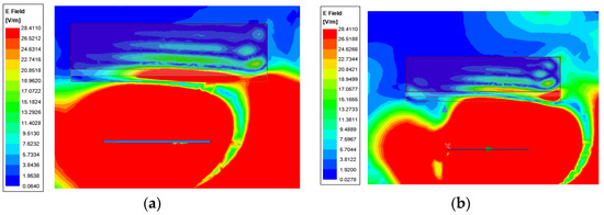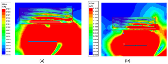 The electric and magnetic field for the antennas placed directly on the tissue are represented in Figure 21 and Figure 22, considering the legend of the representation between 0 and the maximum values of the electric and magnetic field that are calculated according to the standard ICNIRP for the 2.4 GHz. For both structures, the electric and magnetic field are exceeded in all tissue layers considered.