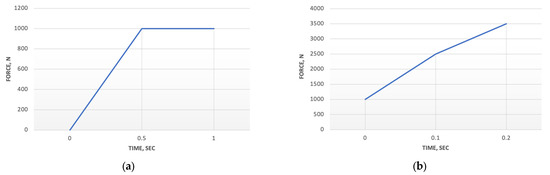 Load distribution in time: (a) direct task (Ansys Transient Structural); (b) shock load task (Ansys Explicit Dynamics).