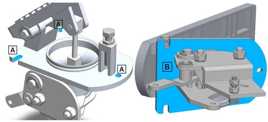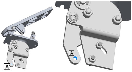 Obviously, the model required an application of displacement constraints, otherwise it would not be statically balanced. The restrictions were set according to the actual fixing of the pedal in the vehicle (Figure 4): (a) rigid fixing (fixed support) in the faces of the mounting holes for the bolted connections of the pedal base with the vehicle floor frame (tag A—Figure 4); (b) limitation of vertical displacements (along the Y axis) of the pedal base using the “Displacement” type constraint in Ansys (part B—Figure 4). Displacement limitation (b) means the mounting of the pedal on the floor surface (floor level is shown in Figure 1b). Horizontal displacements along the X, Z axes were allowed. In addition, a Cylindrical Support-type restriction of the displacements was applied in the eye of the push–pull cable armature (tag A—Figure 5).