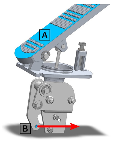The inverse case required imposing opposite conditions, as load was transferred in reverse order: from the cable drive mounting lever (part A—Figure 6) to the foot pedal part (tag B—Figure 6).