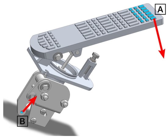 At the same time, constraints described in the direct task were preserved, and the movement of the foot part of pedal was limited by the fixed support of the area of its upper part (part A—Figure 6). Thus, the foot part of the pedal was deprived of the movement/rotation and would limit the travel of the push–pull cable connected to the mounting hole (tag B—Figure 6). The value of the force was 1000 N (it corresponded to the maximum load transmitted by the remote control cable), and its vector was directed along the X axis. The area of the force application corresponded to the cylindrical surface of the fastening fixing hole.