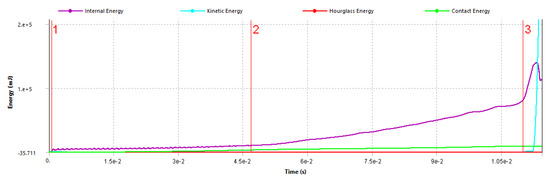 where: CE—work done by constraints; L—work done by loads; BF—work done by body forces; EE—energy removed by element erosion; PF—work done by contact penalty forces. The Explicit Dynamics “Energy Summary” graph is presented in Figure 8 and explained below (it is a screenshot of a graph made by Ansys as a part of the results).