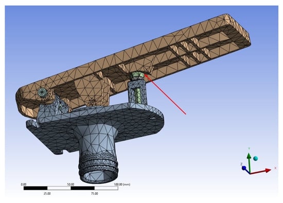 An inquiry into the theory of explicit calculations in Ansys enabled us to investigate the critical case, when the load is applied to the pedal during the shortest possible time period and the pedal itself is located in the position before the contact (Figure 9): it rests against the limiter (appropriate bolt regulating the maximum displacement of the pedal—red arrow in Figure 9). Mesh quality control (Table 2) was used for the case of the Explicit Dynamics analysis model (Figure 9); this mesh was different from that used in the Transient Structural case.