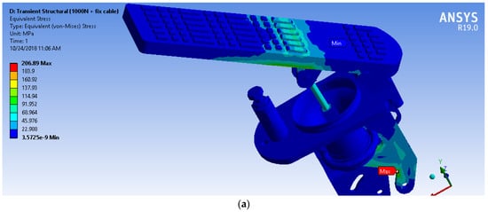 It was proposed that we evaluate the research results on the basis of maximum stress of the investigated model (Figure 10a). Thus, the maximum stress value is 206 MPa and was observed in the bending area of the cable drive mounting lever, which corresponds to the cantilever type of load. The obtained result is within the material strength of this lever. For the pedal itself, however, the values of the maximum stresses were definitely lower (141 MPa) than the yield point of the material used to make the foot part of pedal (EN AC-44400-F, AlSi9)—180 MPa (Figure 10b).