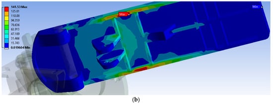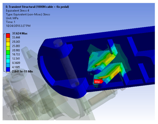 The load distribution character corresponded to that in the direct task shown above. The maximum stress was 37.6 MPa (Figure 11), which indicates a significant margin of strength.