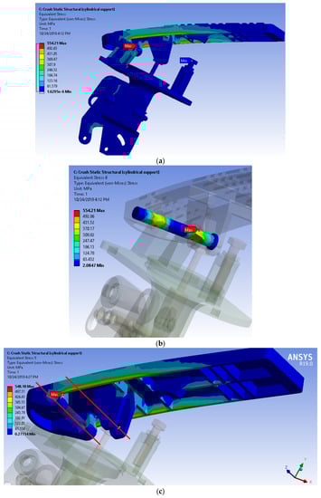 The obtained results presented in the stress map (Figure 12a)—554 MPa—are beyond the strength of most steels, not to mention the yield point. Formally, this was indicated by a rupture of the material of the pin at the rotation axis of the foot pedal part (Figure 12b). The mentioned stress was found in the area of attachment to the indicated pin (Figure 12c). Taking into account the known yield strength of the material (EN AC-44400-F, AlSi9), equal to ca. 180 MPa, it can be stated that the full-scale sample of the tested model would not withstand the loads applied in this calculation mode; the destruction of the pedal foot part is possible in the area between the two pins (Figure 12c), as shown in the photo (Figure 1b).
