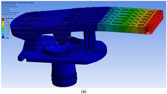 The permissible yield strength, equal to 120 MPa for this most difficult case, corresponded to the lower strength limit of Silumin (casting under pressure). The time distribution of the dynamic load in the conditions of the full-scale tests is presented in Figure 3b: the loads started with 1000 N and continued up to 3500 N until the end of the period of 0.2 s. To perform this FEA, the following working station configuration was used: two physical Intel Xeon 24-core processors, RAM 48 Gb, NVIDIA GeForce 4 Gb video; total calculation time was 7 h 47 min.