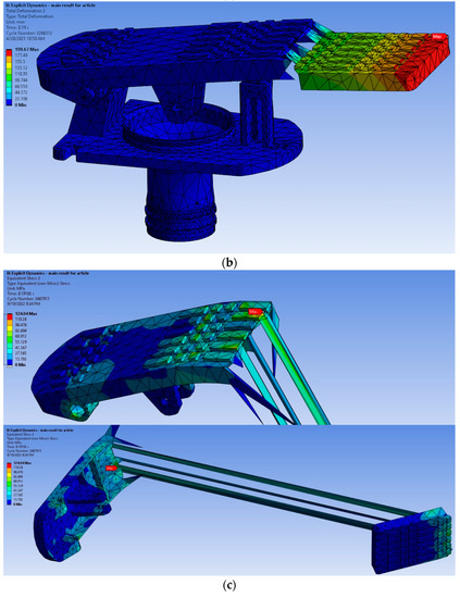 The Ansys Explicit Dynamics module was used for the short-time event analysis (less than 0.5 s), the nonlinearity processes with large deformations, the solid/beam models with nonlinear material properties, contact-intensive loads, and other transient cases with plastic deformation (strain), based on Johnson–Cook equation [17]: