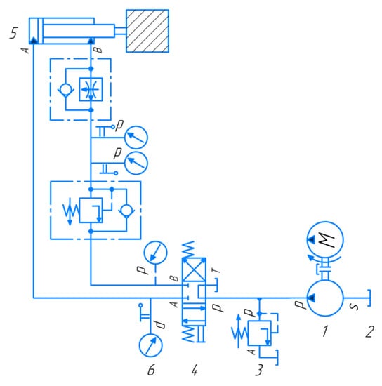 Pump 1 sucked hydraulic fluid from reservoir 2 and delivered it to the hydraulic system. The flow distributor with manual control 4 was in the neutral position. Its valve was held in the neutral position by two centering springs. When the distributor 4 was turned on (left position, indicated by parallel arrows in Figure 15), the working fluid entered the cavity of hydraulic cylinder 5, and the piston rod extended. The force exerted on the piston rod depended on the area of the piston itself and the maximum pressure in the hydraulic system. The maximum pressure in the hydraulic system, and therefore its load, was controlled by pressure-limiting valve 3. The value of the pressure in the system was determined by the pedal’s resistance being overcome and was measured by manometer 6.