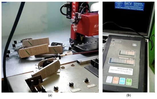 Apart from the breaking tests described above, it is worth explaining that, in fact, each sample of the pedal (model EAAH-MFP02-2340) has to pass the load tests individually, and is checked before being forwarded to the client (tractor factory); therefore, the manufacturer of these pedals needs to perform a qualification check each time. The tests are performed for assembled units, which consist of the pedal and the push–pull cable mounted on the stand (Figure 17a). Unlike the previously described stand (Figure 16), where the pedal rested against the locking bolt serving as a limiter for its travel, this stand limits the pedal’s travel with the help of the push–pull cable, whose end is connected to the strain gauge, which, in turn, is connected to the digital dynamometer (Figure 17b). Therefore, the pedal is mounted to the stand, and the piston rod pushes on its foot part (Figure 17a); the cable accepts the load from the pedal and tries to transfer it to its another end, which is connected to dynamometer (Figure 17b). Therefore, the operator can check the transfer of loads from the pedal to that other end of the cable (there should be no loss of cable travel due to twisting of the core inside the housing). As described in “Hybrid task” (Figure 7b), the input load applied on the pedal was twice lower than the output load on the push–pull cable, i.e., the load transfer coefficient for the pedal was equal to 2. The main goal of this experimental stand was to confirm whether the assembly (pedal with cable) followed the manufacturer’s specifications regarding its safety margin and reliability, as well as guaranteeing the transfer of the necessary load by the cable.