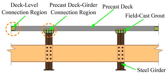 Innovative off-site constructions utilizing prefabricated bridge elements (PBEs) are continuously being developed. Although prefabricated systems have been utilized for many different types of bridge members, prefabricated bridge deck elements have emerged as one of the more popular applications. To accelerate construction, prefabricated bridge deck elements have been utilized since the 1970s [1]. The initial deployment was primarily utilized in deck replacement projects when rapid project delivery was required, to reduce interference with local traffic in densely populated areas. Prefabricated bridge deck elements have since been studied extensively in both field inspection studies, and laboratory investigations [2,3]. The connection material is the first feature influencing the performance of prefabricated bridge deck elements. To be used in field-cast connections, many commercially available grouts have been tested. Previous studies on grout materials have mainly focused on dimensional stability, bond strength to precast concrete, durability, constructability aspects, and new properties [4,5]. The next feature is the surface preparation of prefabricated bridge deck elements at the connection location. Digital images were utilized by Santos et al. [6] to evaluate the surface roughness level in precast concrete with as-cast, sandblasted, and wire-brushed surface preparations. It was found that as the surface roughness level of precast concrete increased, the bond between cast-in-place and precast concrete improved remarkably. Graybeal [7] reported a similar result. Finally, the performance of prefabricated bridge deck elements is greatly affected by the connection details between elements. With the increasingly efficient development of the above influencing factors, full-depth deck panel systems became the best choice. The full-depth deck panel system with stud connector clusters embedded in shear pockets is a typical system. However, there are many matters to resolve when utilizing stud connector clusters such as the shear connection [8,9], consisting of deck uplift, nonuniform shear stress distribution, and local bearing failure of grout in the shear pockets. The use of continuous void connections is an expected resolution, instead of point connections. Graybeal [10] suggested composite girders with prefabricated deck panels connected to precast concrete girders through the injection channels. Experiments were also conducted to investigate the bending behavior of this prefabricated girder and the connection performance. The good results from these experiments indicate that this is a potential connection type for prefabricated bridge elements. Therefore, prefabricated composite girders, with the steel girders and deck panels connected by injecting mechanical grout into a continuous channel above the steel girders to achieve composite action between the steel girders and deck panels, were proposed by Diep et al. [11], as shown in Figure 1. Such connection of prefabricated composite girders is typically made by means of shear connectors placed within a partial depth block-out in the deck panels. This type of block-out solved concerns about durability compared to a full depth block-out, since the full depth block-out has exposed joints around the perimeter of the block-out after the grout is placed. The top deck reinforcement can be placed over the block-out, which simplifies the layout of reinforcement in the deck panel. In addition, the continuous connection will allow more closely-spaced shear connectors, and uniform shear stress distribution. Greater haunch height can be advantageous for the flow of grout under the deck panels and adjustment during precast deck module installation and connection. Because of such outstanding advantages, this type of connection needs more research attention to accelerate its applicability. In this study, a design of the railway bridge prototype using prefabricated composite girders was conducted. Additionally, prefabricated composite girders were developed by deploying different new innovative girder-to-deck connections through geometric detailing of reinforcement, stud connectors, and precast decks, and their detailed design was carried out based on the calculation theory of interface shear transfer, especially the design of spacing between bars of reinforcement connecting the precast deck and the grout which controls the connection design. Furthermore, finite element analysis of prefabricated composite girders was conducted to determine the flexural moment strength of prefabricated composite girders. Parametric studies were carried out to consider the factors affecting the detailed design of the connection, ensuring that the connection is properly designed, and thereby ensuring the structural performance of the prefabricated composite girder.
