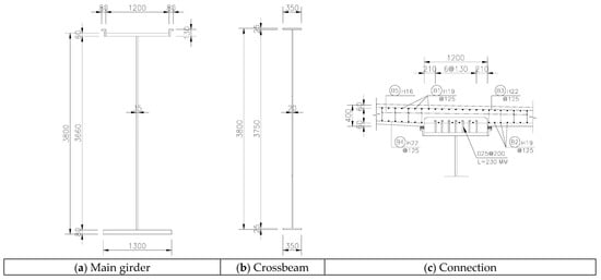 The railway bridge prototype of prefabricated composite girders with girder-to-deck connections was designed to facilitate future application enhancement of off-site construction. As indicated in Figure 2 and Figure 3, the prototype bridge was designed with a bridge width of 13.46 m and a 49.8 m span. The bridge carries 2 traffic lanes and 2 pedestrian lanes. The superstructure includes 2 prefabricated composite girders. The deck is 325–400 mm thick. The steel girders have a height of 3.8 m and a distance between girders of 6.2 m. Figure 4 presents the detail of the members of the railway bridge prototype.